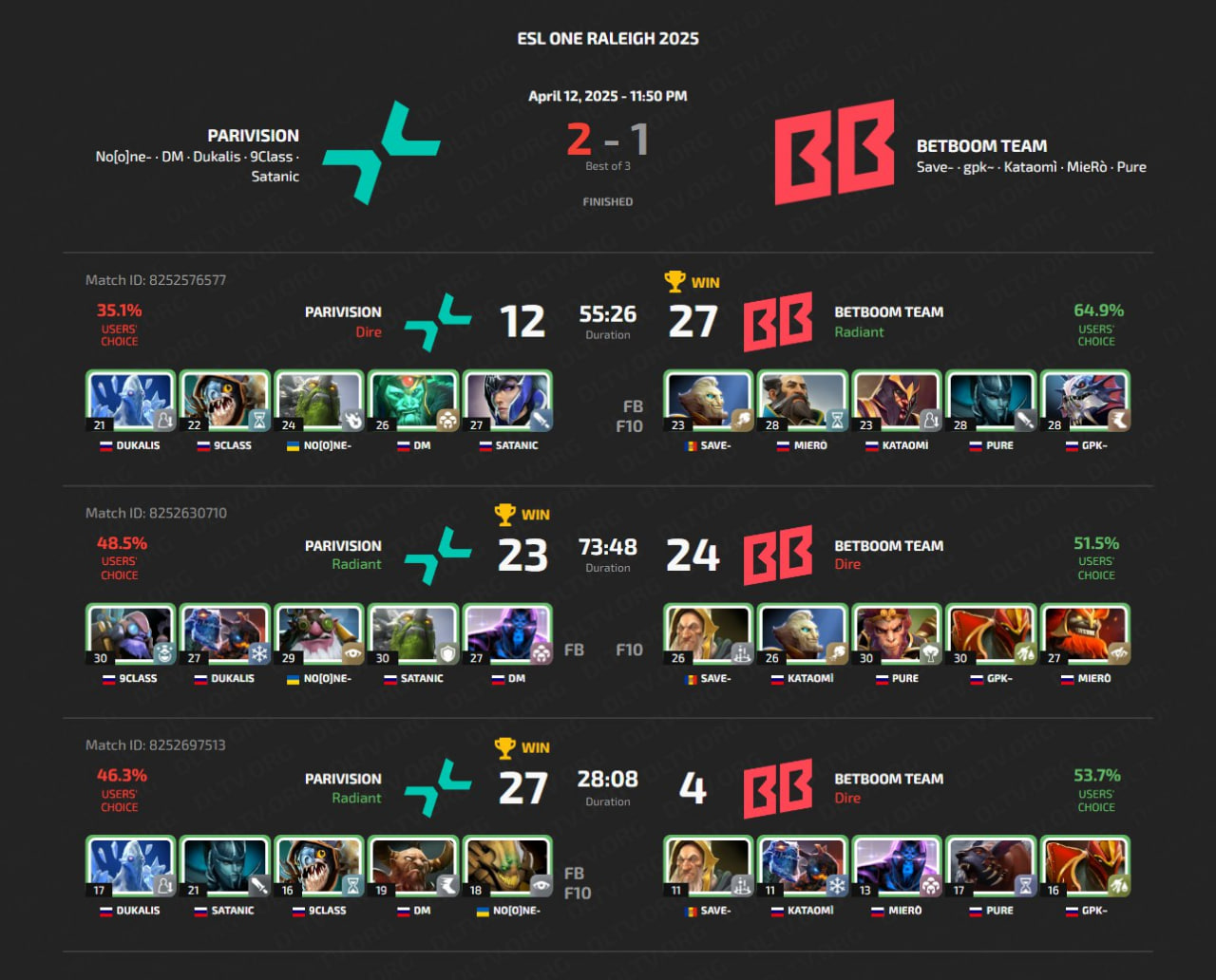 У BetBoom Team не хватило сил на решающую карту, до этого матча они сыграли с Team Falcons, матч закончился со счетом 2-0. PARIVISION разгромили BetBoom Team со счетом 27-4. 9Class на сигнатурном Slark не давал соперникам выйти с базы, постоянно ломая варды и сетапя фраги.
