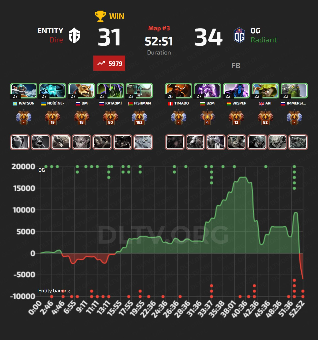 Решающая карта выдалась очень напряженной. Оба коллектива шли ровно, но OG удалось вырваться вперед благодаря феноменальным Black Hole от Wisper на Enigma. Так, они набрали почти 20 тысяч перевеса по золоту. Entity Gaming не сдались, отлично подобрали момент и поймали OG по одному, после того как вторые забрали Рошана. Игра вернулась к исходному состоянию, команды оказались в равных ситуациях. Самым захватывающим моментом стала последняя драка. Герои умирали, байбекались и возвращались в файт.