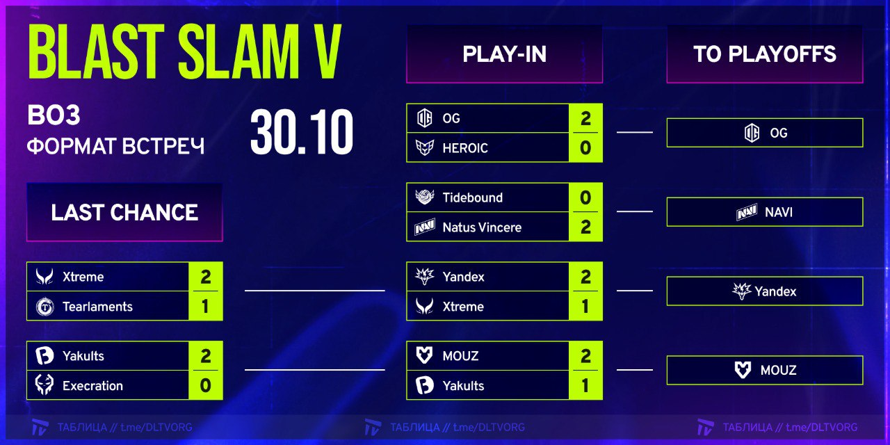 La fase di play-in di Blast Slam V è giunta al termine. Dopo i risultati delle partite, sono passati ai playoff MOUZ, Natus Vincere, OG e Team Yandex. È curioso che nessuna delle quattro squadre cinesi sia riuscita a passare ai playoff, che si svolgono in Cina.