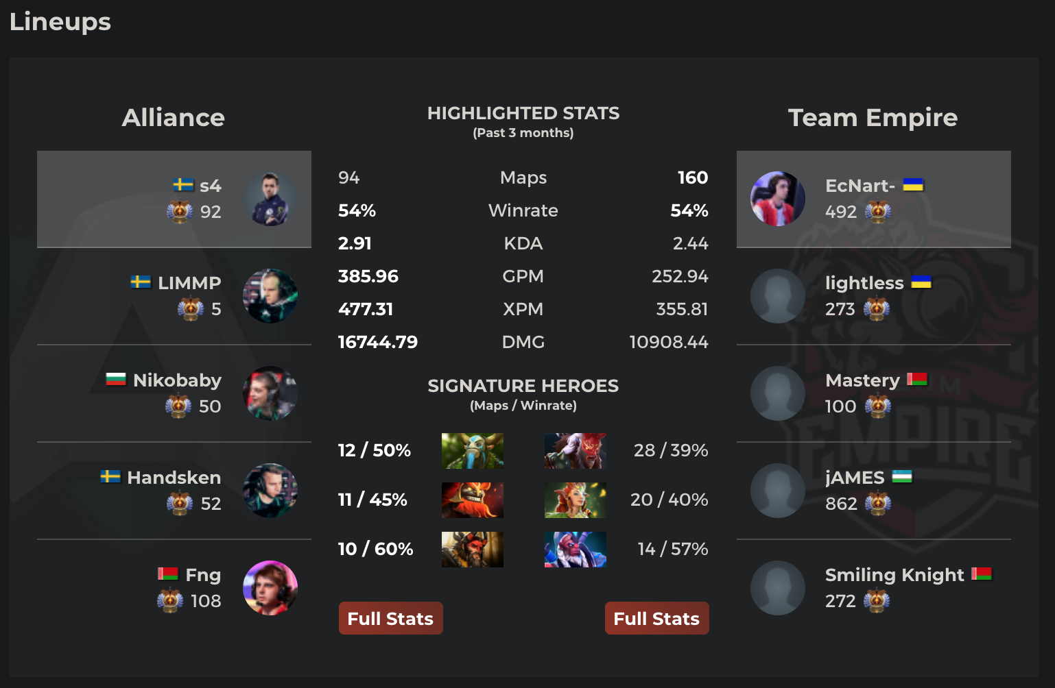 Здесь вы сможете сравнить показатели участников команд, а также увидеть, каких персонажей они чаще всего используют.